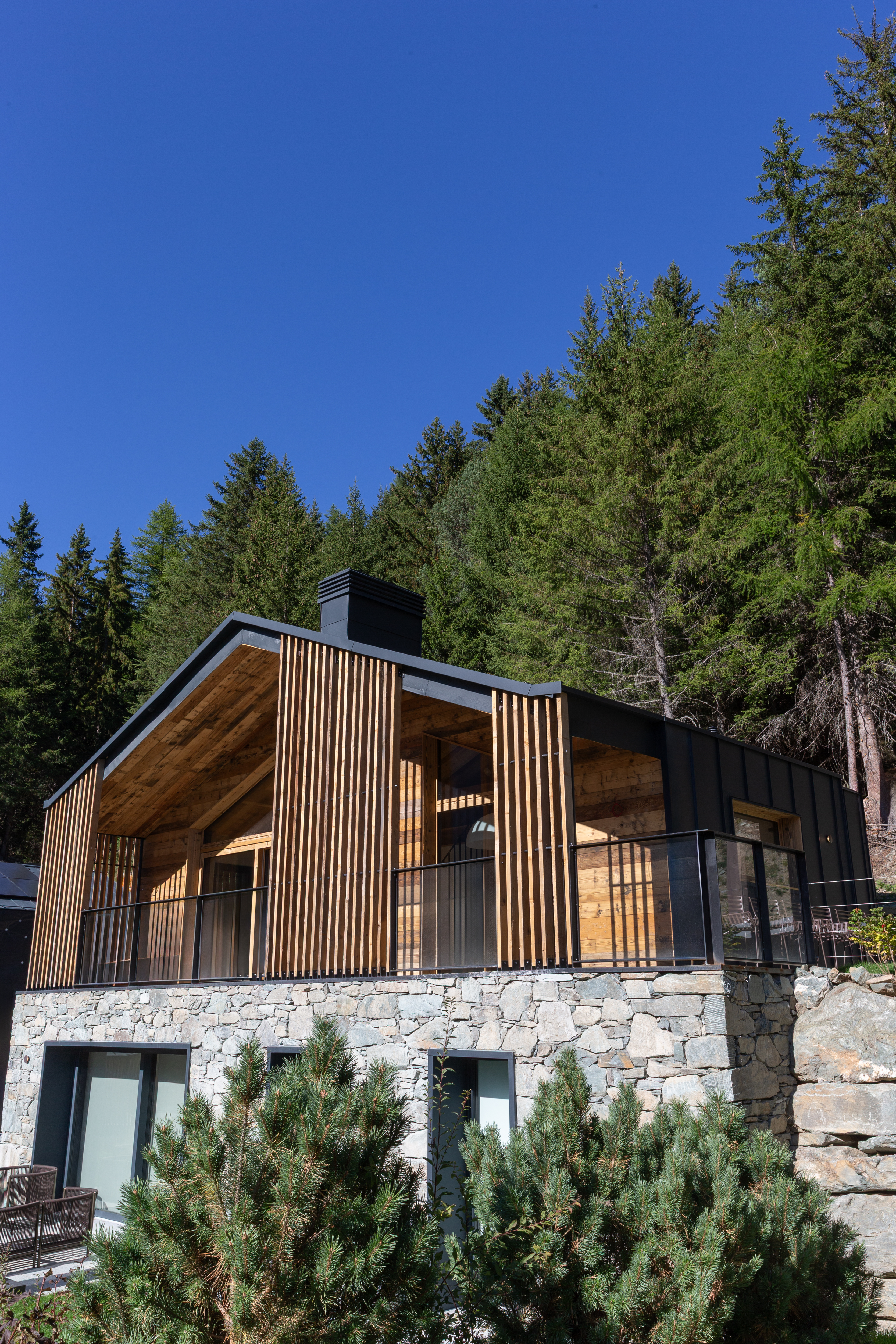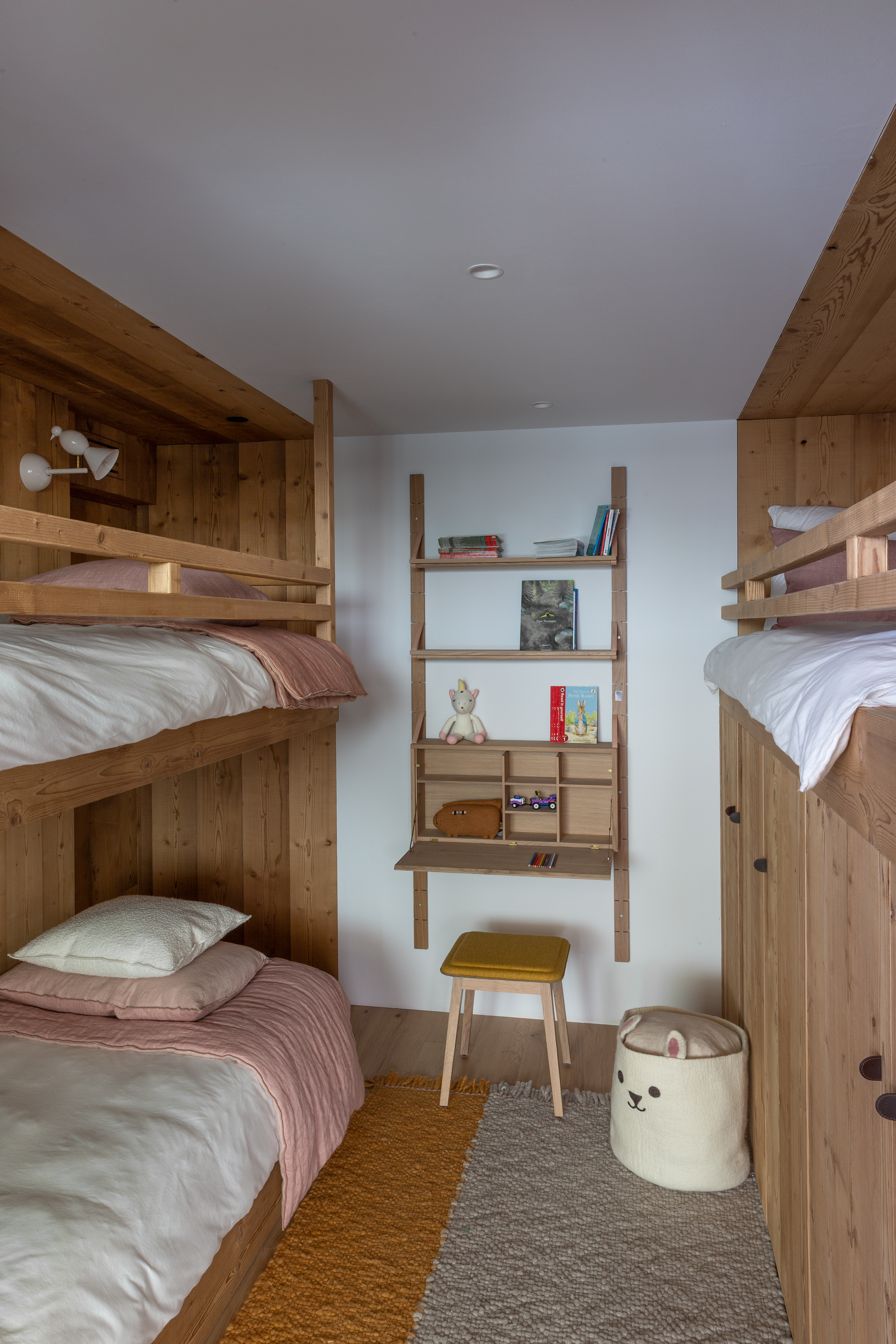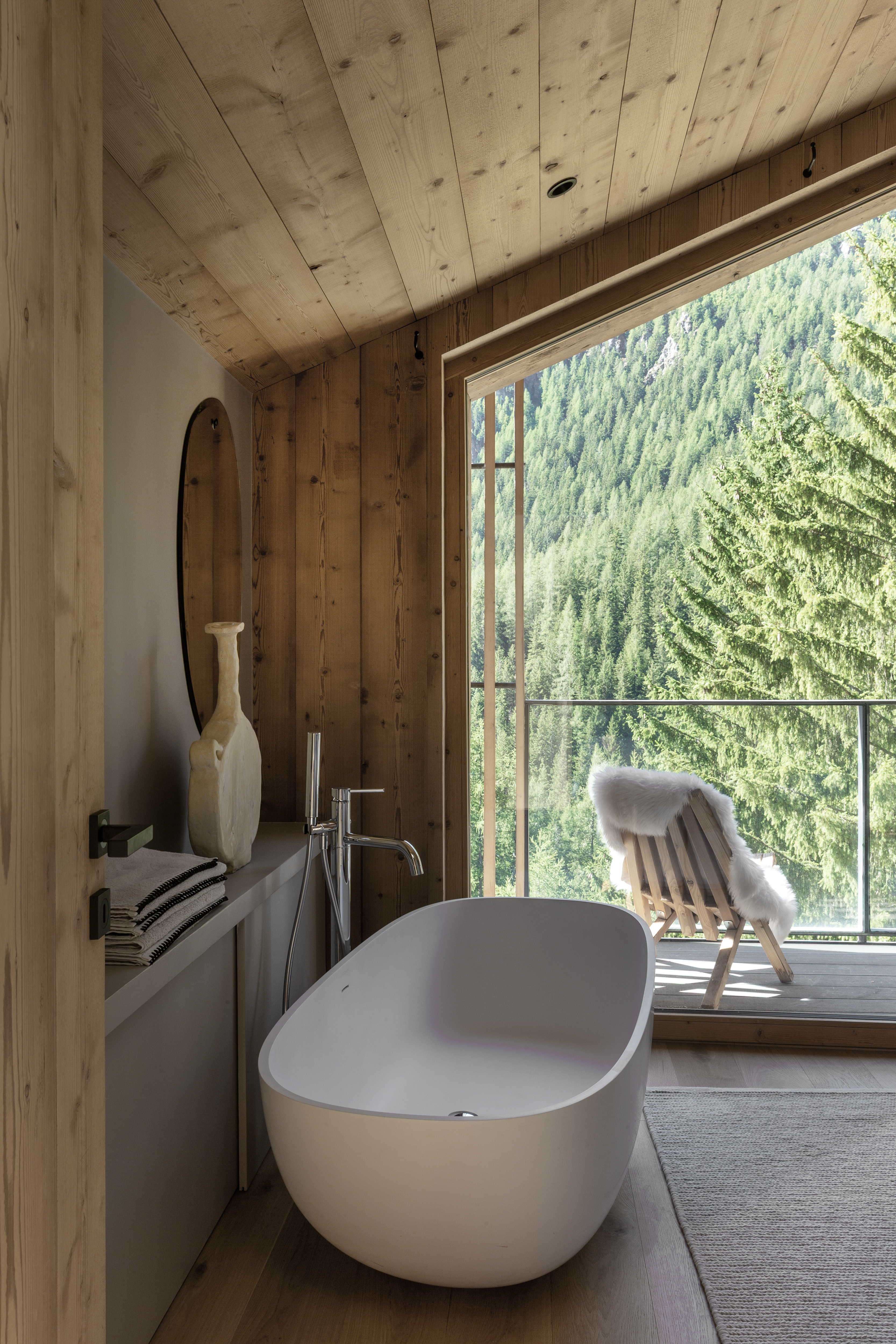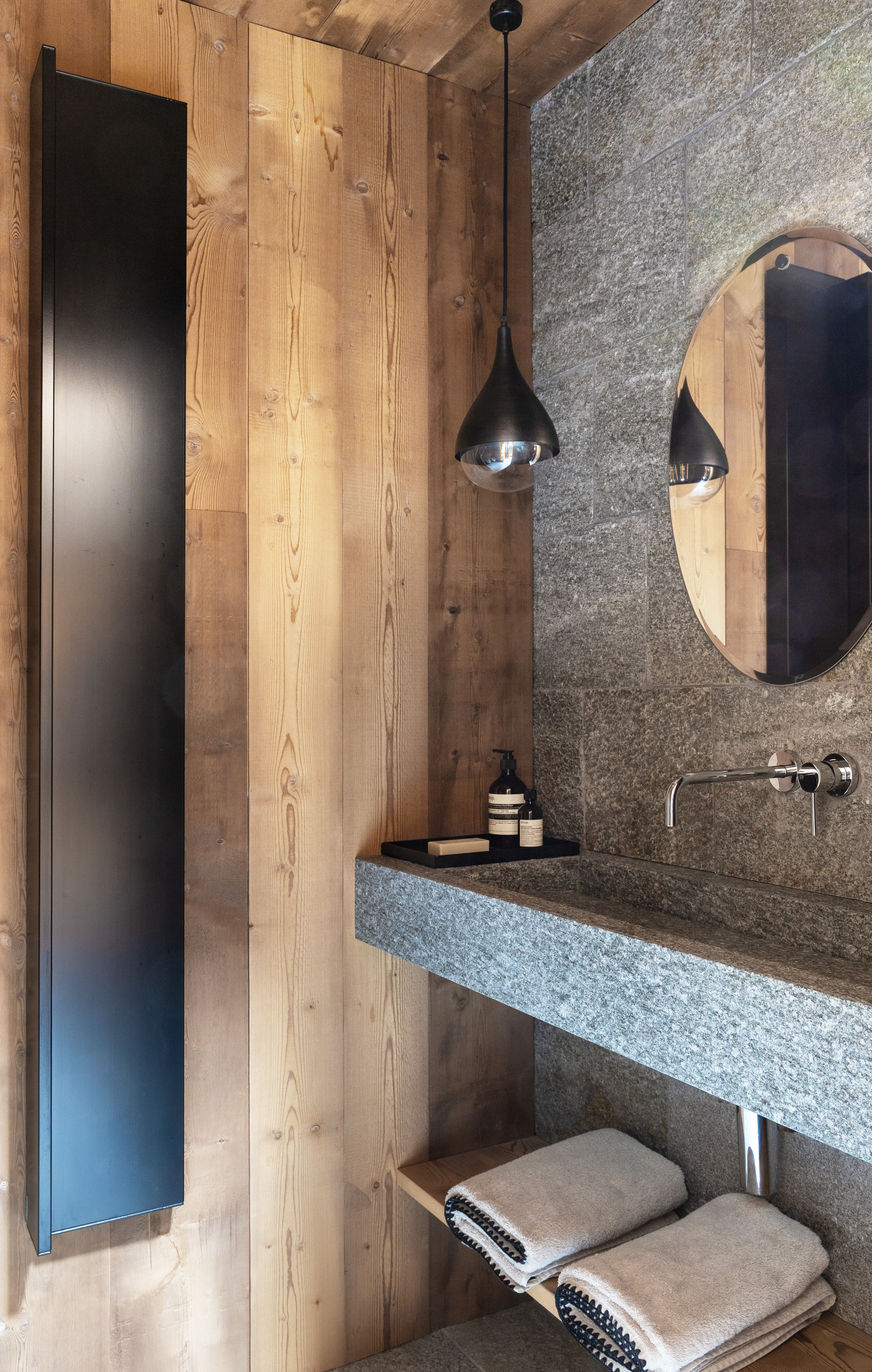 L’intérieur devait être en harmonie avec la modernité l’architectural de ce projet dans le Val d’Ayaset. Très vite le travail sur la ligne c’est imposé. Le chalet s’anime avec un jeu de lumière et s’apprête à vivre au rythme des saisons et la nature environnante. L’intérieur est épuré et doux, confortable et moderne, comme pour mieux se lover le week-end au cœur des sapins après une semaine urbaine au tempo démultiplié.